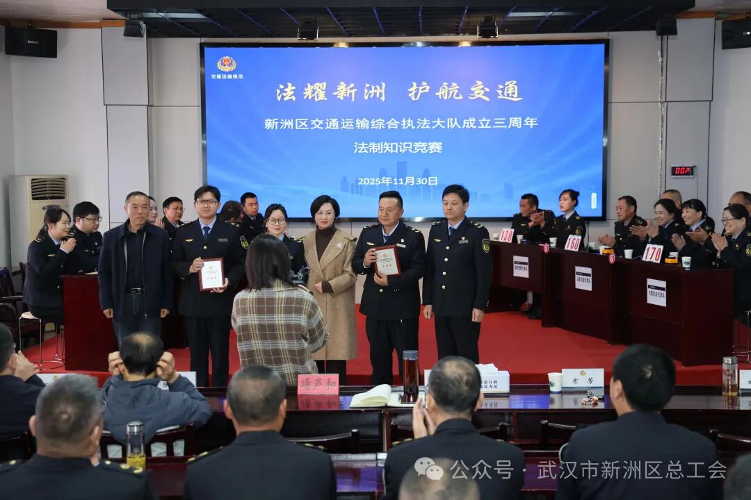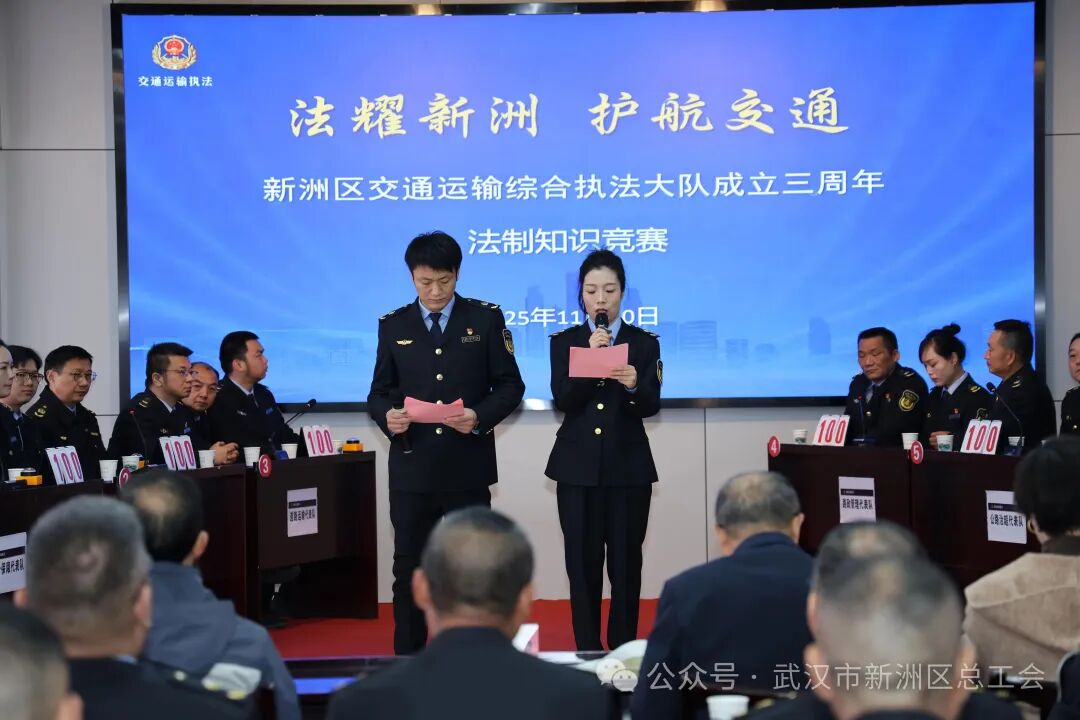 为庆祝大队成立三周年,全面提升执法人员法治素养和业务能力,营造尊法学法守法用法的浓厚氛围,2025年11月30日,新洲区交通运输综合执法大队在区交通运输局六楼会议室成功举办“法耀新洲护航交通”法制知识竞赛活动。区交通运输局、区司法局、区委宣传部、区总工会等相关单位领导应邀莅临指导,大队全体成员参加活动。