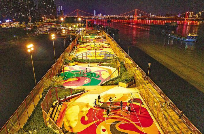 夜幕降临,武汉市汉阳区杨泗港都市T台“国风”篮球场灯火辉煌。(湖北日报全媒记者 朱熙勇 摄)