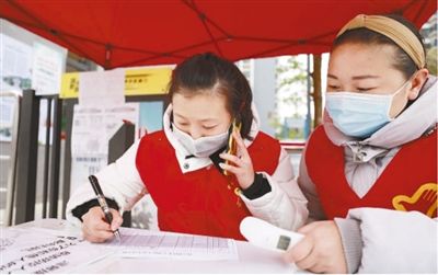 2月14日,河北省沧州市运河区花园社区工作人员在小区出入口 为居民测体温。 |
