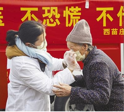 近日,山东省临沂市兰山区西苗庄社区体温监测点,社区工作人员正在为一位老人佩戴口罩。 |