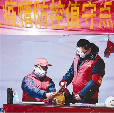 2月15日晚,安徽省肥西县上派镇四十埠社区疫情防控值守点,工作人员坚守岗位,晚餐吃碗泡面。 |