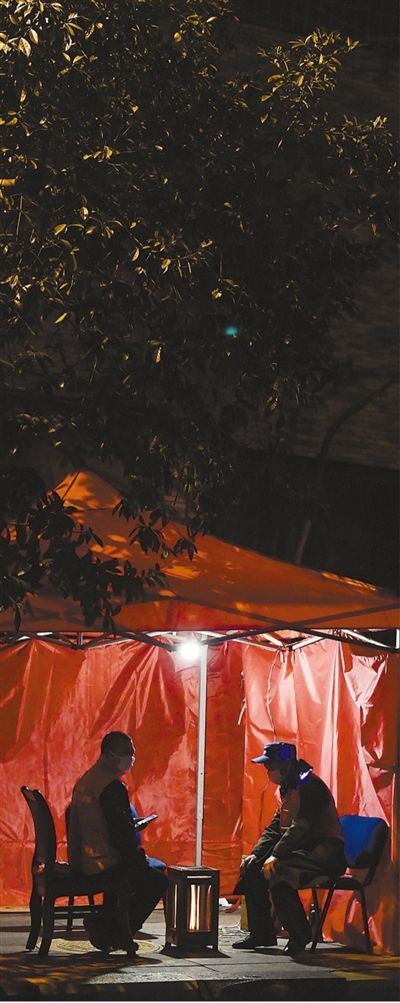 2月11日晚,在贵州省贵阳市云岩区中天社区疫情防控值守卡点,工作人员在值守。 |
