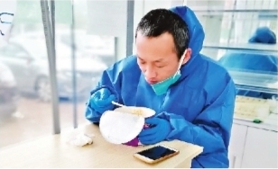 黄忠豹中午在药店吃碗泡面继续赶路 |