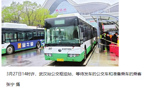 “一出武汉站东出站口,就有公交扫码乘车咨询台;附近的公交站台上,也有穿‘红马甲’的公交志愿者。这些志愿者们都查验了我们的健康码、指导我们提前通过手机进行‘武汉市实名登记乘车’线上认证、引导我们依次排队乘车等,服务很热情、很周到,要点赞!”3月27日15时,在武汉火车站公交枢纽站候车的29岁乘客时先生感叹道。
