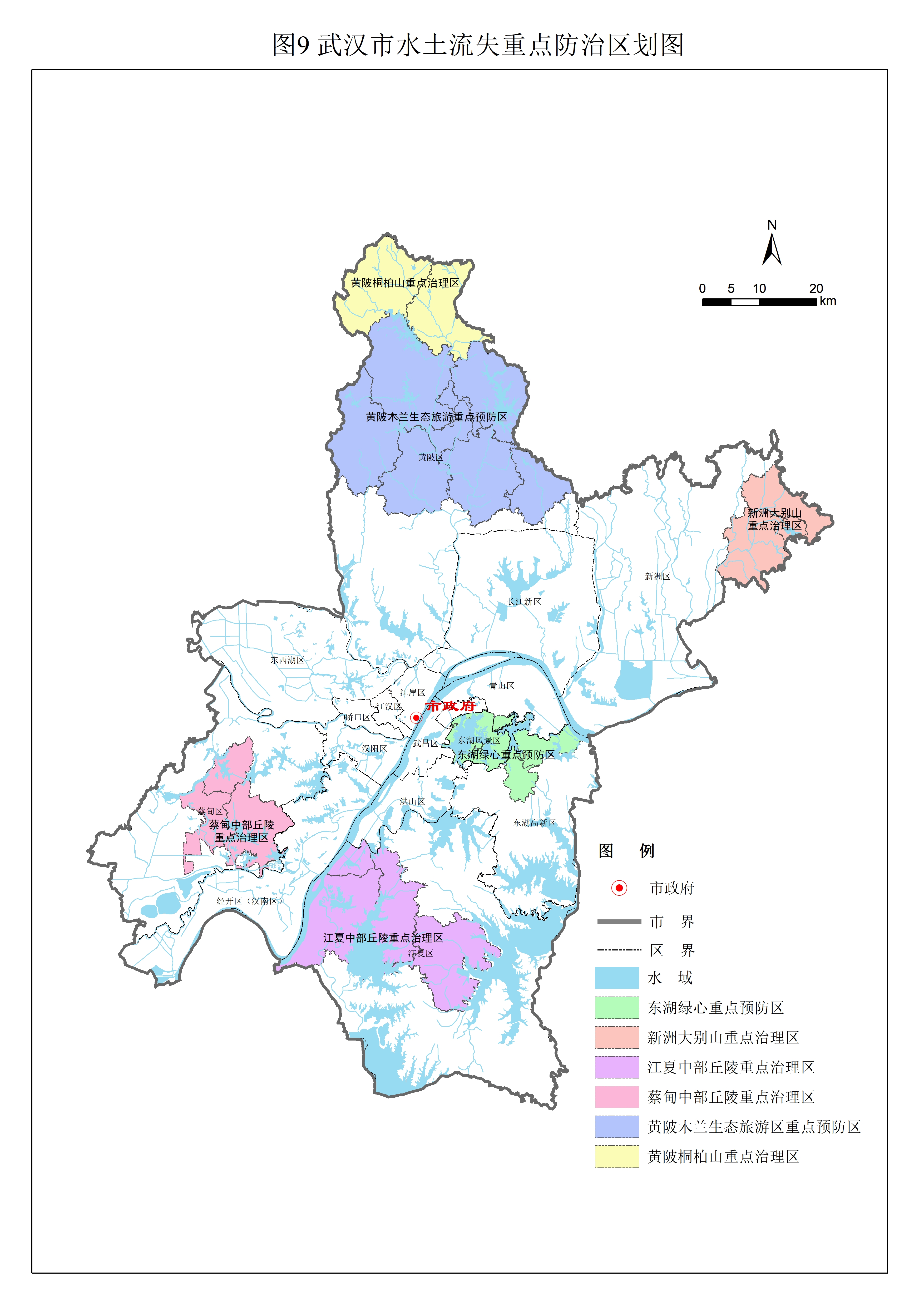 根据市级水土保持规划划定,新洲区大别山为市级水土保持防治重点区,新洲区不涉及市级水土流失重点预防区。
