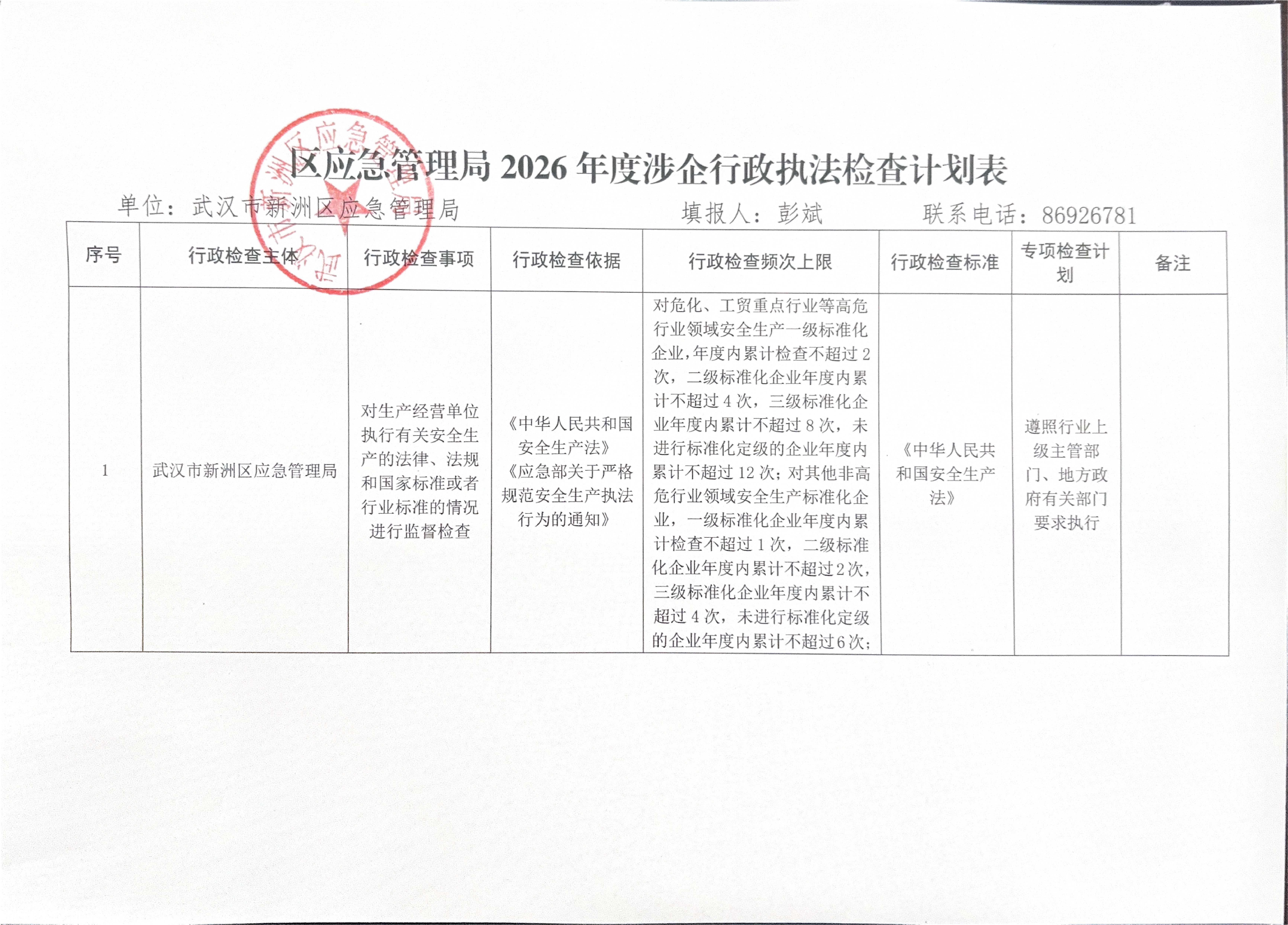 区应急管理局2026年度涉企行政执法检查计划表