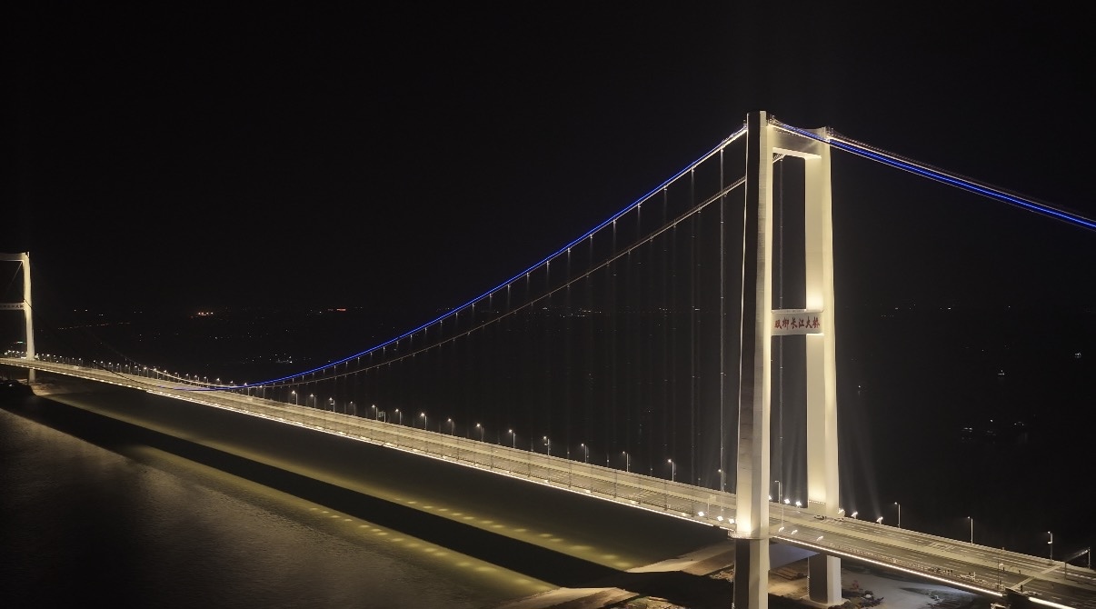当晚,距离江面100多米高的主缆上,数万盏LED照明灯依次亮起,将大桥的身姿在夜色中勾勒得格外壮丽。